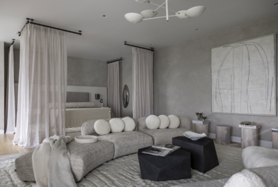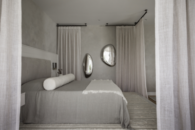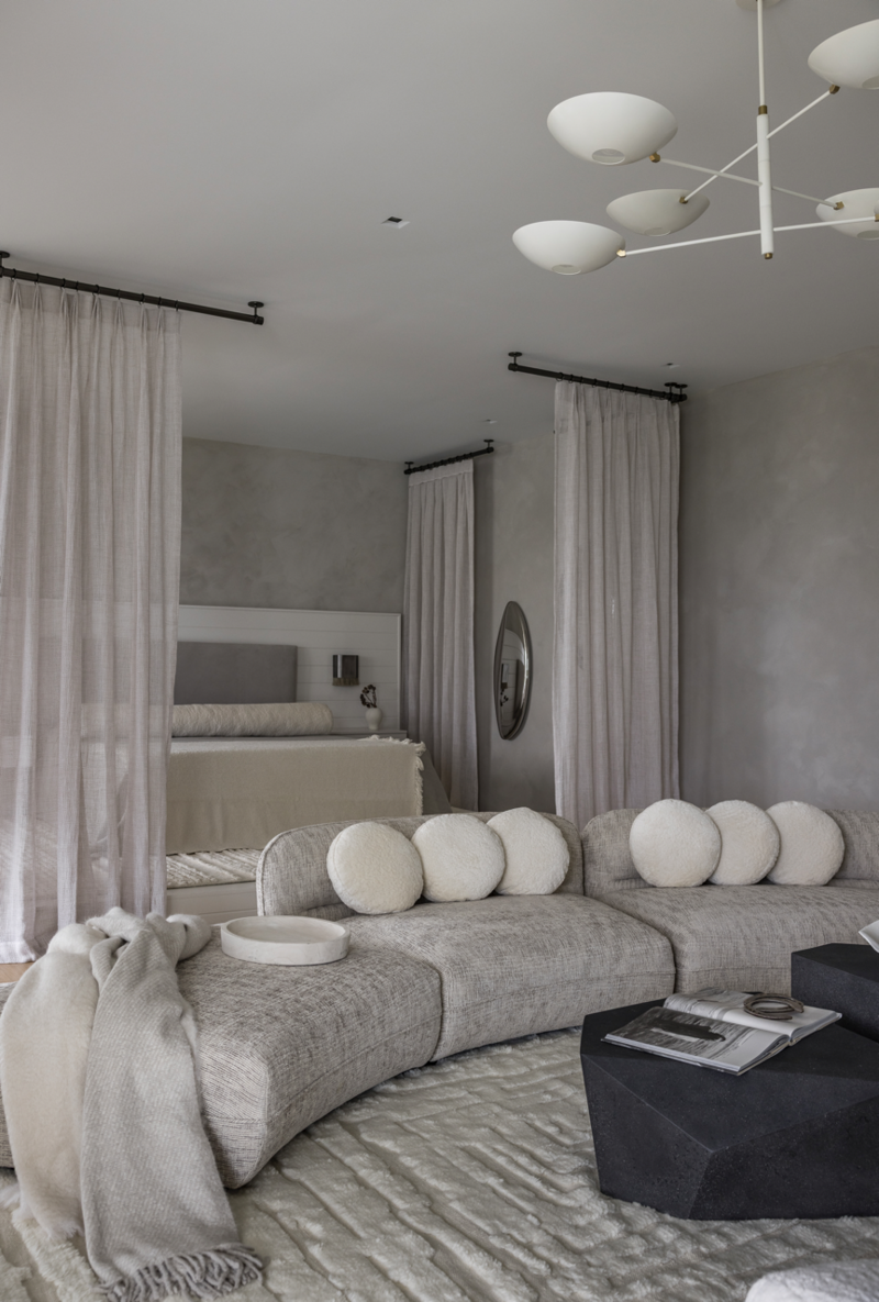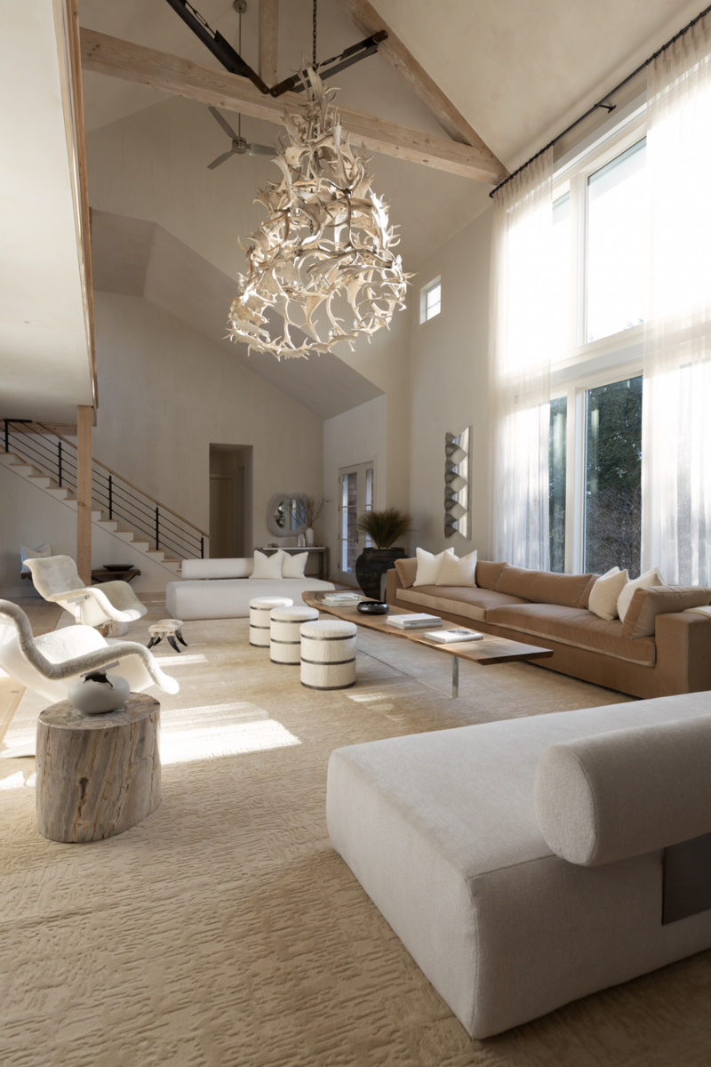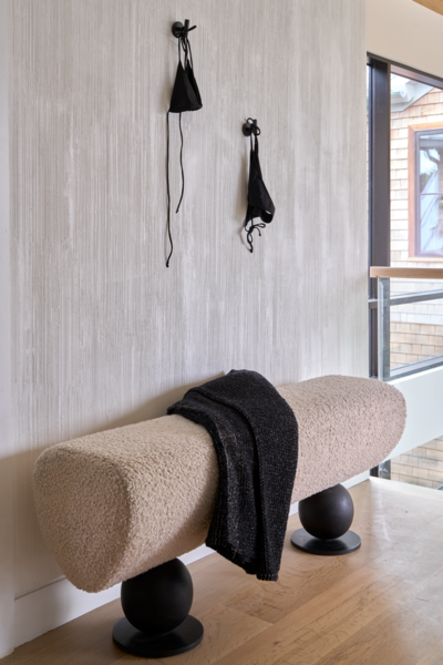 "Brianna Scott Interiors crafted a veritable coastal oasis in the primary bedroom, where textured neutrals, hide accents and intentional layering convey rugged elegance."